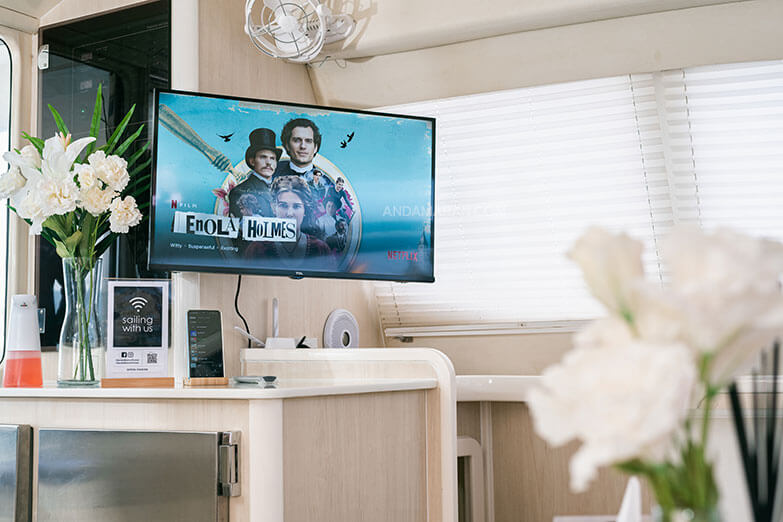 宽敞的船上空间设计,船首设有大型网兜供您观景,船尾设有带顶棚的露天餐桌。主客舱采用米白色调,宽敞舒适的沙发让您尽享惬意。 - Flexible Itineraries: Choose between a Full Day Trip (up to 30 passengers) or an Overnight Trip (up to 6 passengers with 3 cabins available).