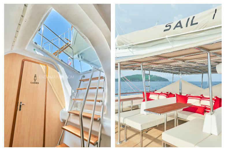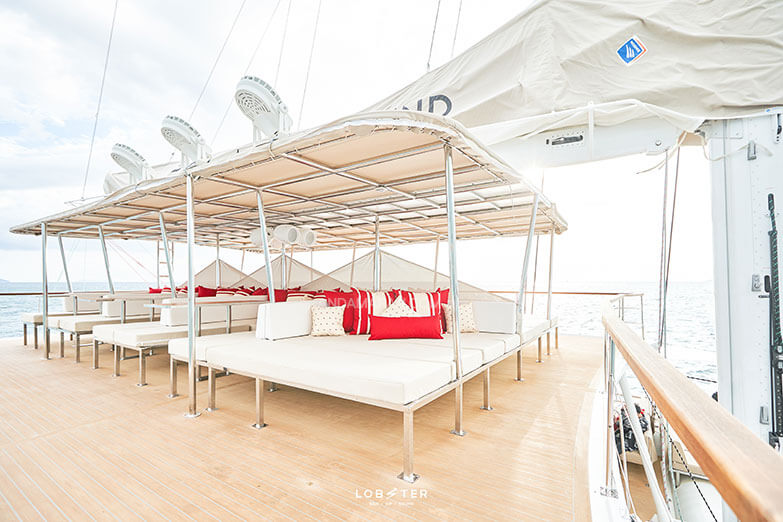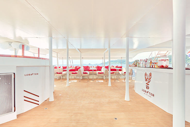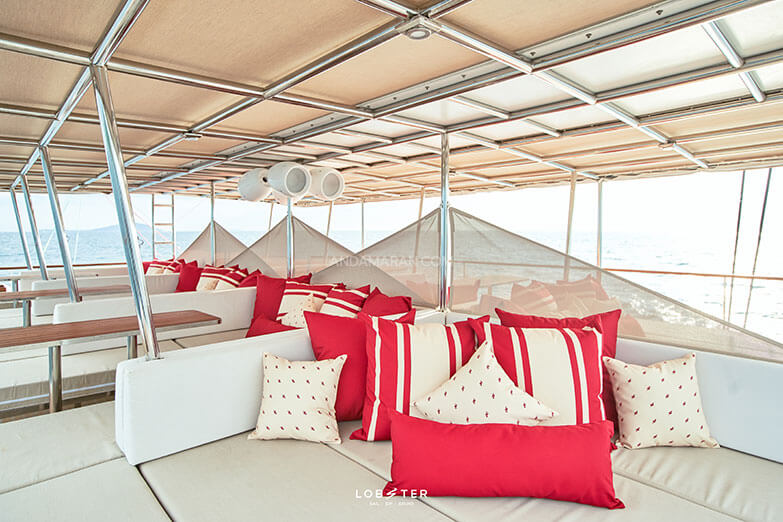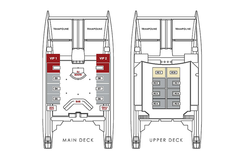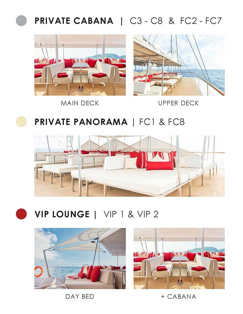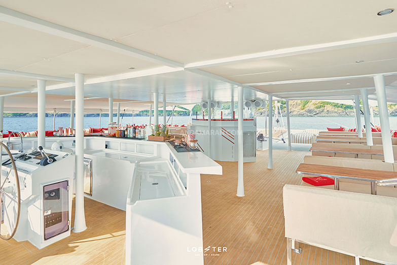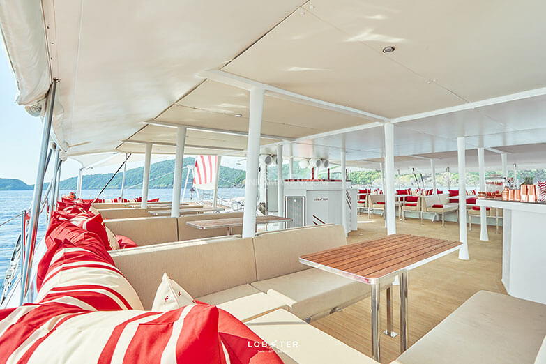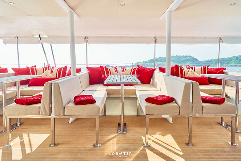 奢华派对概念:令人惊艳的红色主题双体帆船,专为私人游艇派对打造。 - Spacious Area: 78ft length with main deck and upper deck. Features cabana tables and panorama day beds.