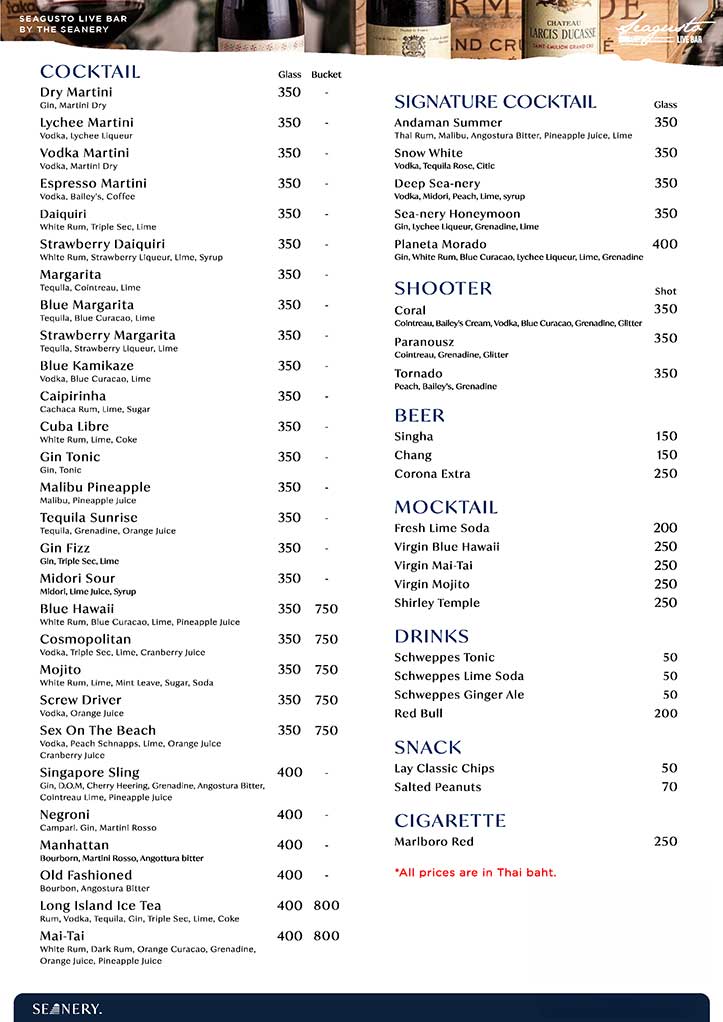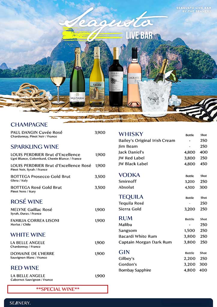 Spirits: 1,000 THB/Bottle. (20 Bottles package: 10,000 THB).